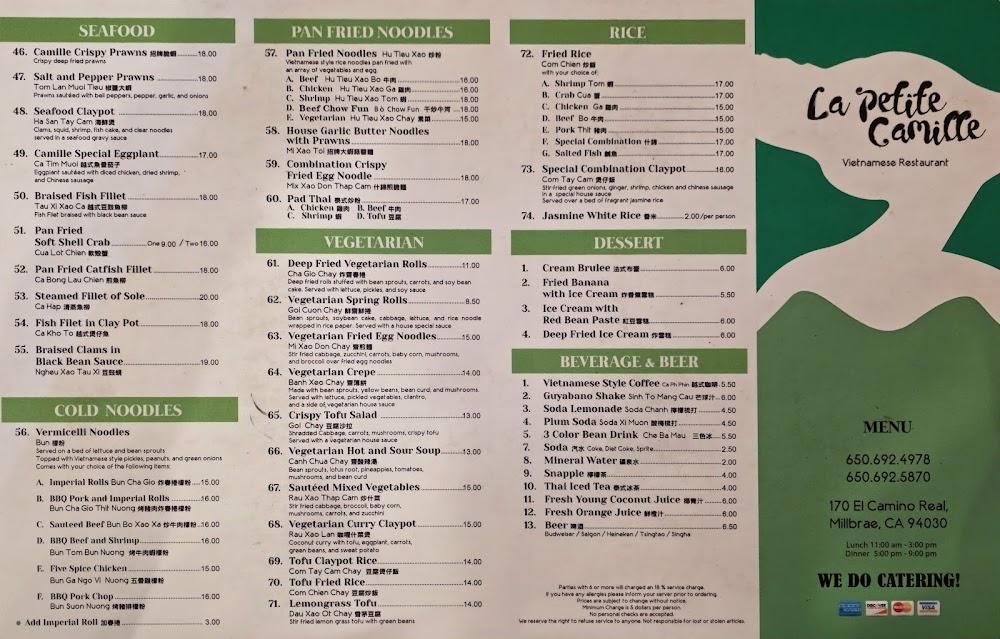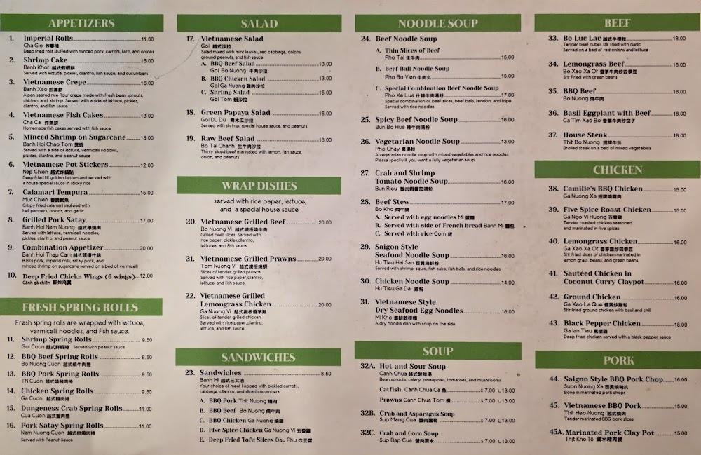 The menu at La Petite Camille features a variety of Vietnamese offerings. From nourishing pho to sizzling banh xeo, options abound for all palates.